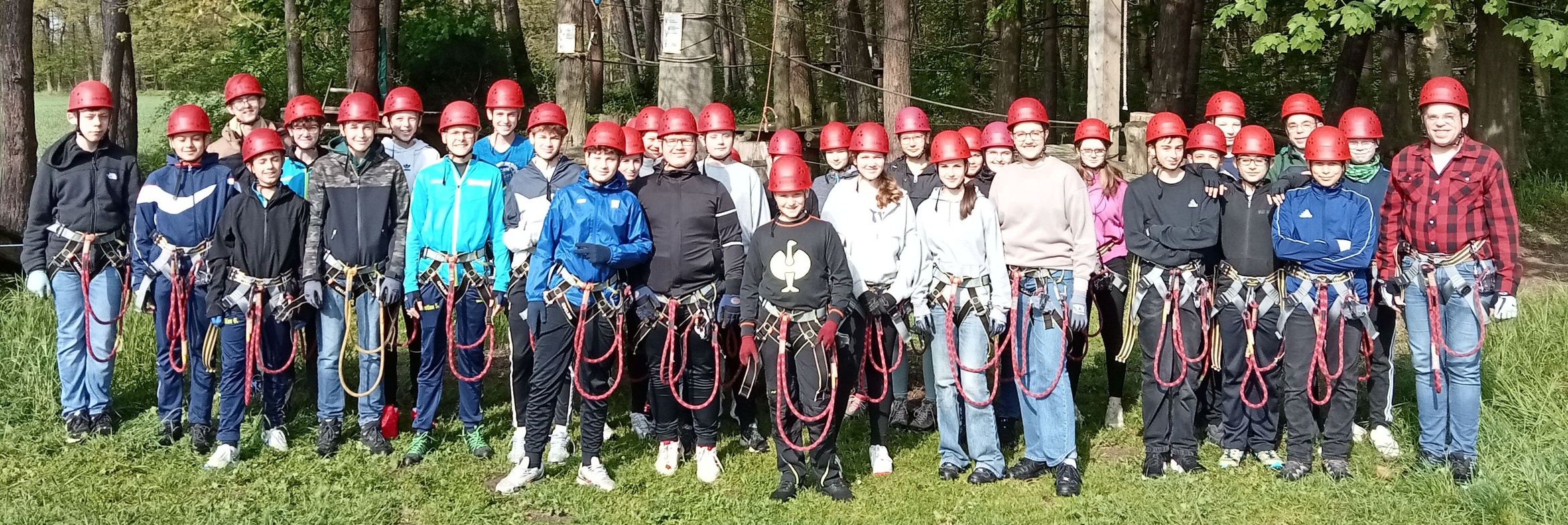 Dertingen. 34 Firmbewerber aus dem pastoralen Raum Marktheidenfeld versuchten erlebnispädagogisch im Kletterpark Silvestria in Dertingen, ihre Erfahrungen im Hochseilgarten mit den eigenen Lebenserfahrungen zu verbinden. So wie im Kletterpark verschiedene Höhen und Hindernisse bestanden und überwunden werden müssen und sich die Teilnehmer auf den verschiedenen Plattformen immer wieder ausruhen dürfen, wenn sie ein Zwischenziel erreicht haben, so ist auch ihr Lebensweg geprägt von Höhen und Tiefen, von Hindernissen, die sie bestehen müssen und auch von Zwischenetappen, nach deren Erreichen sie sich ein wenig ausruhen und durchatmen dürfen. Im Kletterpark wie auch im richtigen Leben sind die Teilnehmer nicht allein gelassen. Als soziale Wesen sind sie auf Gemeinschaft angelegt, um sich wechselseitig zu ermutigen und auch Ratschläge zu geben, wie der Weg weitergehen und gut gelingen kann. Die Seilrolle, die immer wieder auf das Seil aufgesetzt wurde, führt automatisch zum Ende des Weges am Seil entlang und so ist es auch übertragen auf das eigene Leben. Wer sich vom Heiligen Geist Gottes führen lässt, wer auf seine innere Stimme hört und ihr vertraut, den möchte Gott zum Ziel seines Lebens führen. Bei strahlendem Sonnenschein und blauem Himmel genossen die Jugendlichen sowohl den Kletterpark als auch die Gemeinschaft.