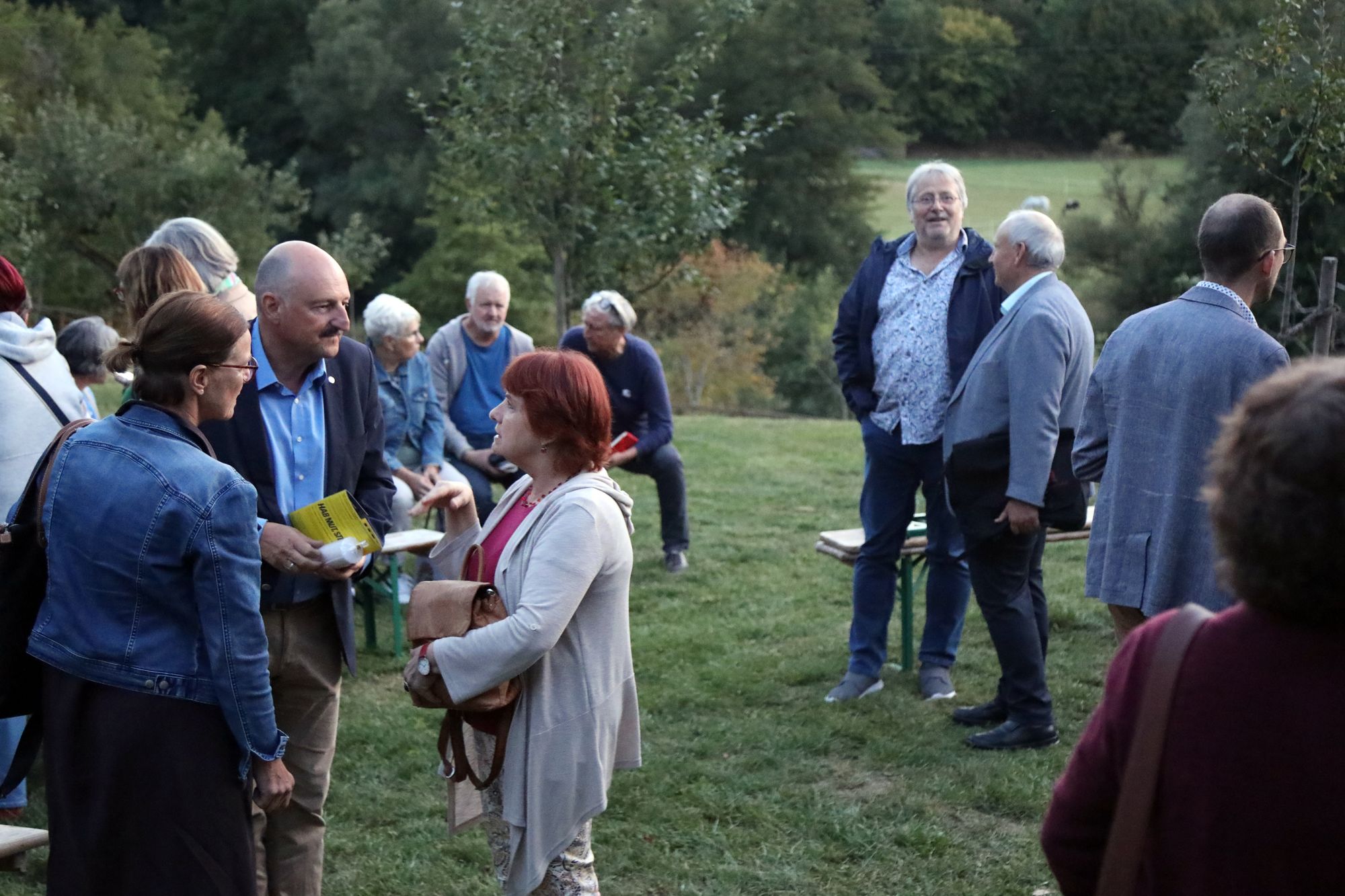 Schönau (POW) Wo muss sich Kirche bewegen? Und wo kann jeder mit seinen Fähigkeiten und Begabungen dazu beitragen? Darüber haben die Gäste einer Podiumsdiskussion mit dem Titel „Kirche im Umbruch“ am Dienstagabend, 2. September, im Garten des Klosters Schönau (Landkreis Main-Spessart) gesprochen. Vor rund 70 Zuhörerinnen und Zuhörern diskutierten Marc Frings, Generalsekretär des Zentralkomitees der deutschen Katholiken (ZdK), Katholikentags-Botschafterin Nadja Kapperer aus Karsbach (Pastoraler Raum Gemünden), Bundestagsabgeordneter Bernd Rützel und Domkapitular Albin Krämer, Bischofsvikar für den Katholikentag, über Herausforderungen und Chancen der Gemeinden vor Ort. Die Veranstaltung fand im Rahmen einer dreitägigen Fahrradtour von Frings von Mainaschaff bis nach Miltenberg im Vorfeld des 104. Deutschen Katholikentags 2026 in Würzburg statt.