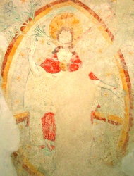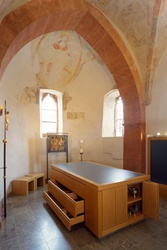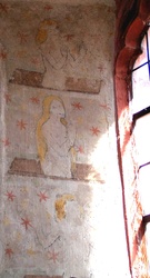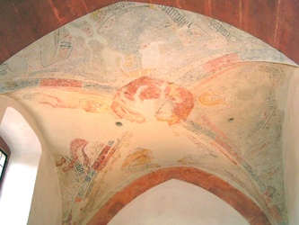 Sie stehen nun vor zwei Türen. Die rechte Türe führt in die heutige Sakristei, die der früheren Wehrkirche aus dem 12. Jahrhundert als Chorraum diente. Die darin wiederentdeckten mittelalterlichen Fresken aus dem 15. Jahrhundert, mit Christus als Weltenherrscher in der Apsis und den Symbolen für die Evangelisten am Deckengewölbe, stellen die ältesten Bildmotive dar. Da die Sakristei nicht besichtigt werden kann, können sie sich auf der Homepage ein Bild davon machen.
